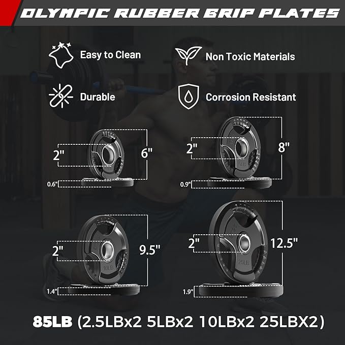 - 【85LB Barbell Set】The set includes a 6-foot barbell with a pair of collars and a set of 85lb weight plates: 2x2.5lb, 2x5lb, 2x10lb, 2x25lb. With the barbell included, the total weight adds up to 115lb. These cost-effective equipment are perfect for long-term training use.