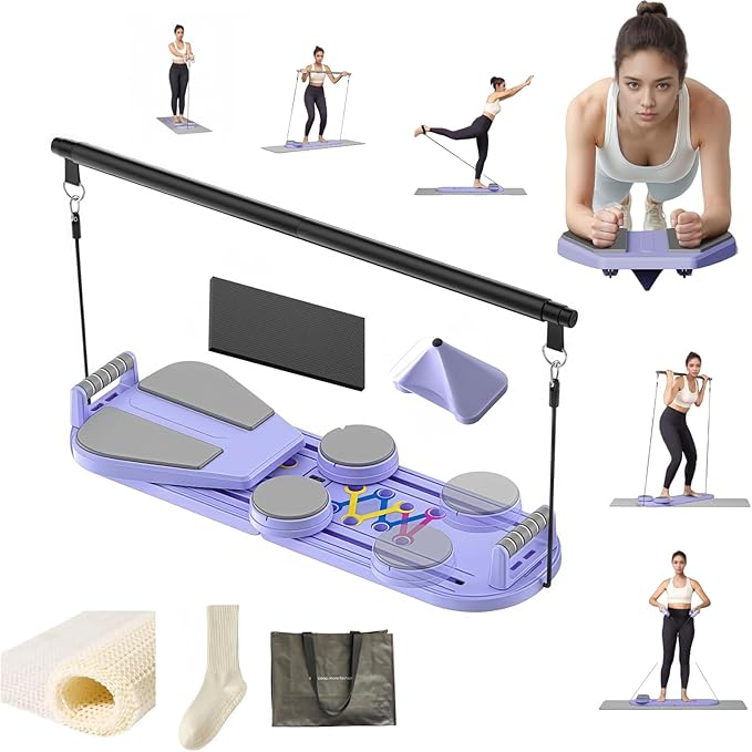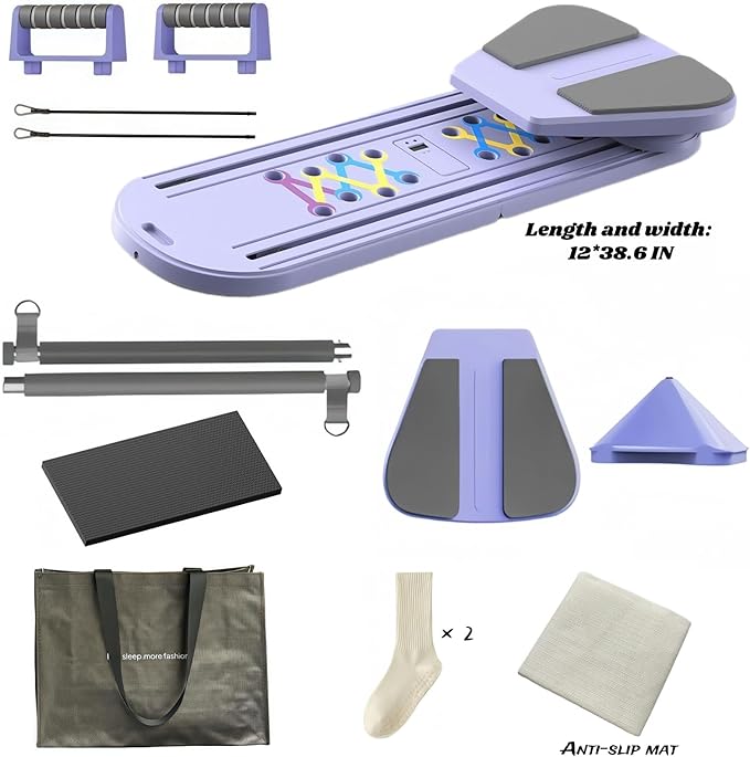 - [Multifunctional Fitness Equipment-comes with non-slip mats, non-slip gloves, non-slip socks, resistance bands, and a packaging bag]This versatile Pilates Reformer incorporates more than 15 exercise modes, including an ab wheel, resistance bands, balance board, push-up handles, and dynamic plank support, allowing you to easily change your workout. It is perfect for building core strength, building muscle, and improving flexibility,
