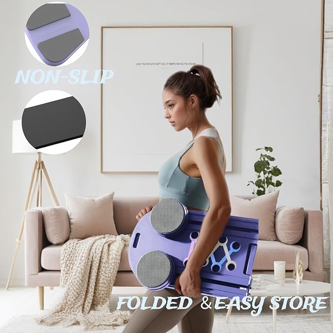 - [Portable and space-saving foldable design] Enjoy a studio-level workout experience anytime, anywhere! The lightweight foldable fitness board saves 50% storage space and can be easily put into a closet, under the bed, or in a travel bag. It can be used at home, in the gym, outdoors, or on the go without requiring extra space. It for easy storage and travel.