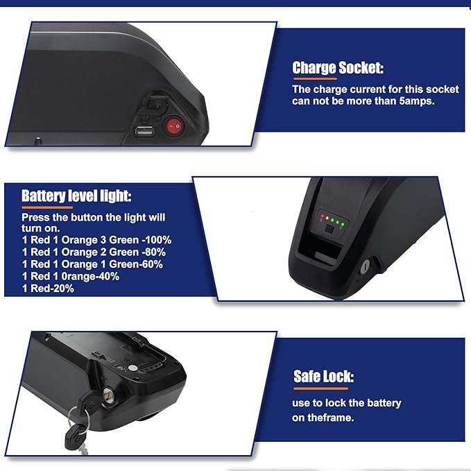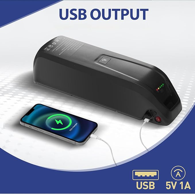 - 【Enjoy convenient power】 Our 48v ebike replacement battery are customized with high-end packaging for easy portability. The LED power indicator on the body can remind you to charge on time. And equipped with a safety lock to prevent theft. In addition, the USB port allows you to use it with other devices, such as mobile phones and Bluetooth speakers, anytime and anywhere.