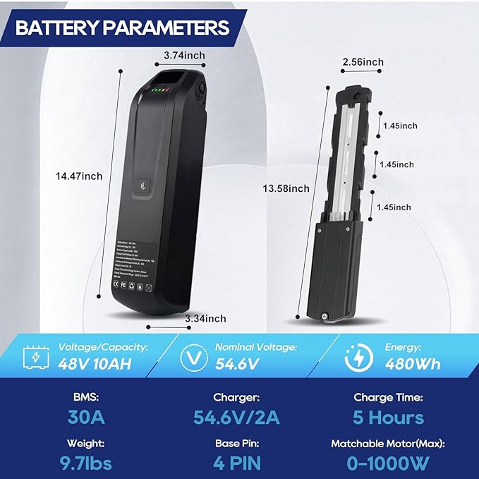 - 【Basic Parameters and Packaging List】This ebike battery is 48v 10ah 4 pin battery, fits for the motors of between 0-1000W. Battery Size: 14.47*3.74*3.34 IN.Weight:9.7LBS.1 x 48V 10AH e-Bike Battery,1 x XT-60 Discharge Cable, 1 x 2A Rapid Charger, 2 x Security Lock Keys, 1 x Male XT-60 Discharge Connector, 3 x Screws.
