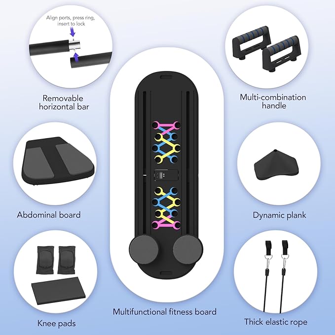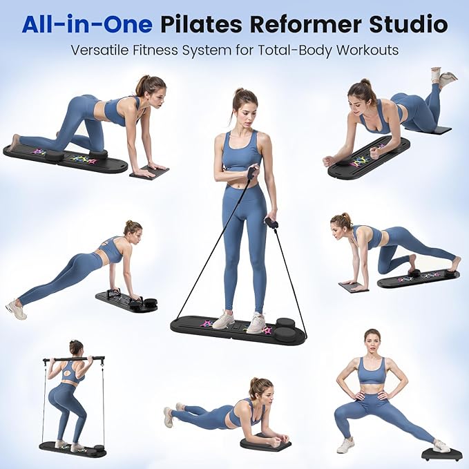 - 【8-in-1 Pilates Board】Compared with the traditional pilates equipment, our 8-in-1 pilates reformer set combines a pilates board, ab roller, push-up handles, resistance bands, plank support and balance board in one unit, unlocking at least 15 exercise movements. Perfect for full-body toning, it effectively targets your core, abs, arms, legs and glutes - ideal for fat burning, muscle shaping and rehabilitation training for all fitness levels.