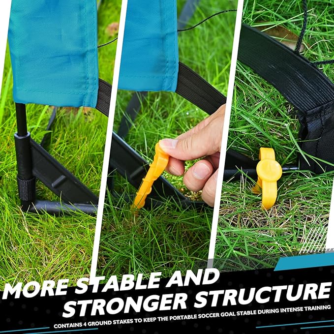 - Heavy-Duty Ground Stakes for Stability - Comes with strong ground stakes that firmly anchor the soccer goal to grass or soil. Prevents tipping or shifting during play, allowing kids and teens to train with confidence and safety.