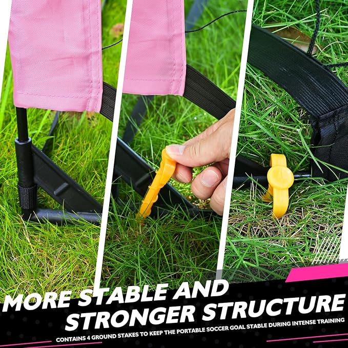 - Heavy-Duty Ground Stakes for Stability - Comes with strong ground stakes that firmly anchor the soccer goal to grass or soil. Prevents tipping or shifting during play, allowing kids and teens to train with confidence and safety.