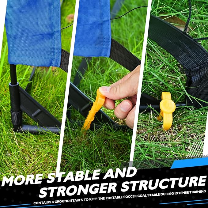 - Heavy-Duty Ground Stakes for Stability - Comes with strong ground stakes that firmly anchor the soccer goal to grass or soil. Prevents tipping or shifting during play, allowing kids and teens to train with confidence and safety.