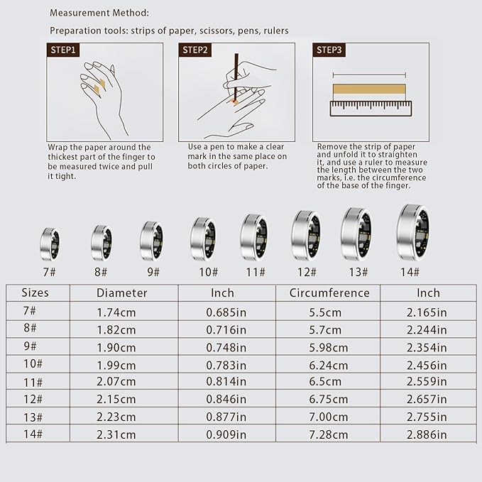 - 【Select the Right Size】: Measure your finger circumference using our size guide to ensure the best fit. The Anarow smart health ring is available in eight sizes (non-adjustable). If between sizes, choose the larger one for comfort and more stable sensor contact