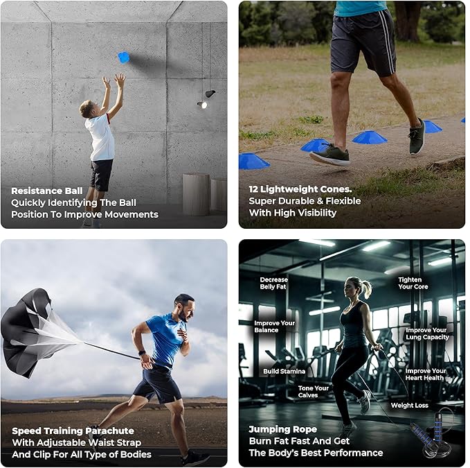 - "Agility Training Equipment Kit": Includes a 2 * 20ft agility ladders with 8 ground stakes, 4 adjustable agility hurdles, 12 vibrant yellow disc cones, and a high-resistance running parachute. Perfect for all skill levels—from beginners to pros—this set is built to elevate your speed, coordination, and overall athletic performance.