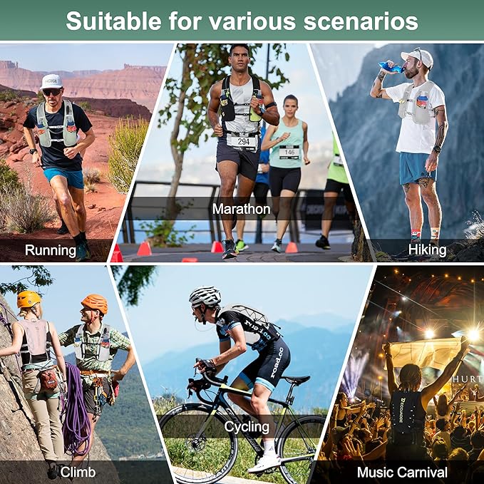 - Adventure-Ready with Added Features: This running hydration vest pack features reflective strips (front and back) for low-light visibility, a built-in emergency whistle, trekking pole holders, and adjustable compression cords for stability. Reinforced stitching ensures durability. Ideal for trail running, hiking, cycling, and endurance events.
