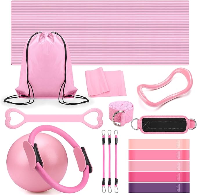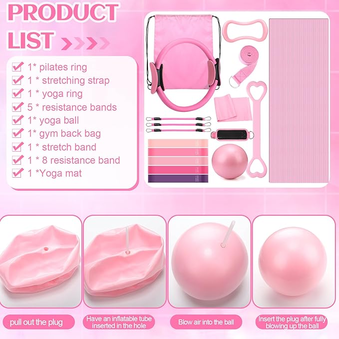 - Comprehensive Pilates Equipment Set: pilates equipment set includes 1 Pilates ring, 1 Pilates ball, 5 yoga resistance bands, 1 figure 8 resistance band, 1 fabric resistance band, 1 yoga mat, 1 elastic band, 1 arm stretcher, 2 ankle resistance bands, 3 latex tubes and 1 fitness drawstring backpack; This well-designed set can meet various Pilates exercise needs, providing a complete solution for home exercise