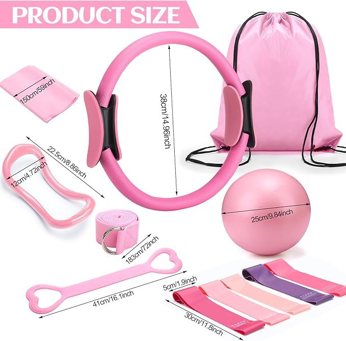 - Suitable Sizes: pilates fitness ring is 9.8 inches in diameter, yoga elastic band is 59 inches/ 150 cm long, ball is 9.84 inches/ 25 cm long, fitness backpack size is 13.39 X 16.93 inches/ 34 x 43 cm, latex tube is about 13 inches/ 33 cm long; These right sized accessories ensure convenience and ease of use during exercise
