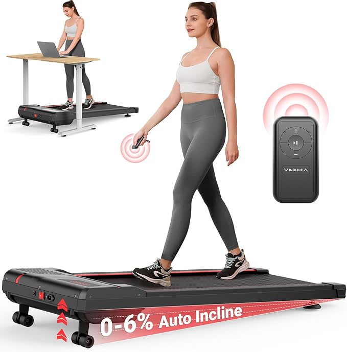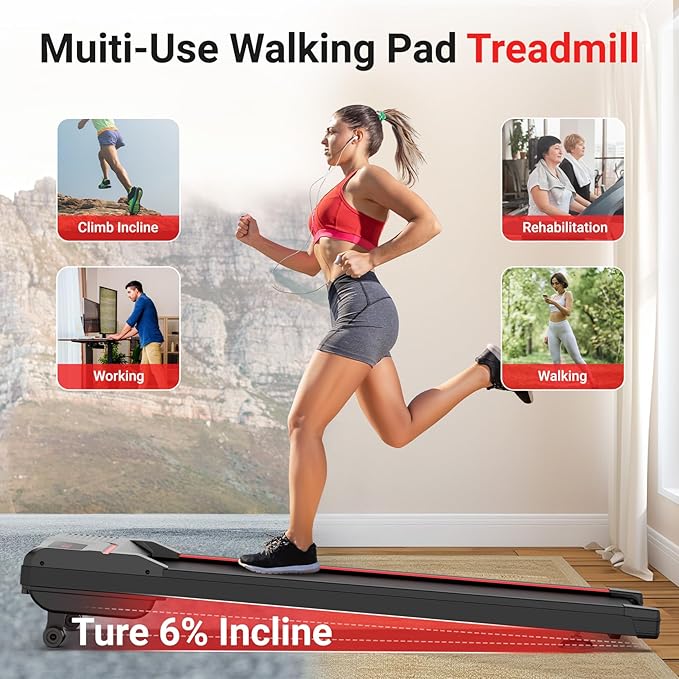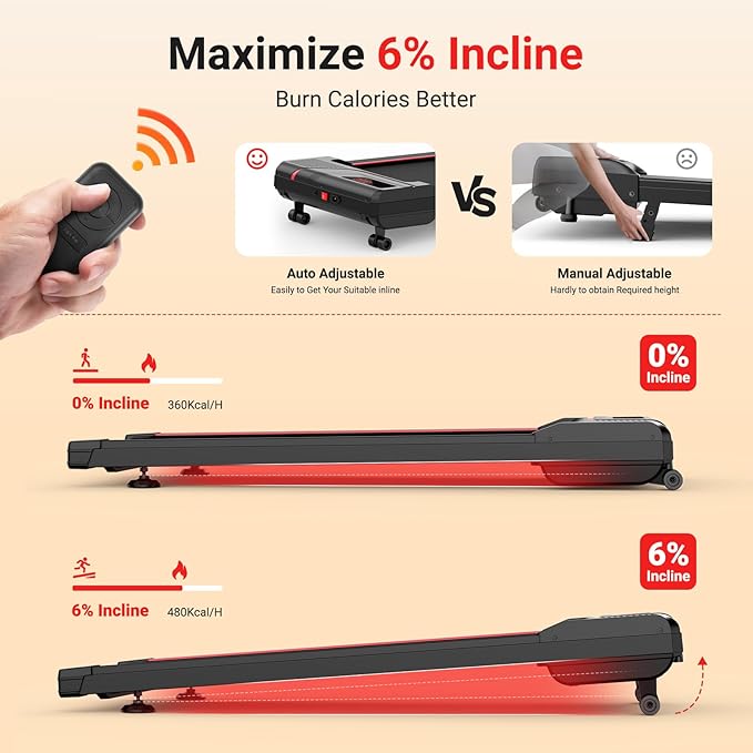 - Auto-Adjust Incline: This walking pad with incline features 6 levels Automatic Incline (0%-6%). Perfect for post-workout recovery, speed training, or stamina building. Incline running maximizes calorie burn while promoting balanced muscle development, ensuring high-intensity but low-impact workouts at home. Whether you're a casual walkers or a dedicated runner, you could discover your required speed on this incline walking pad.