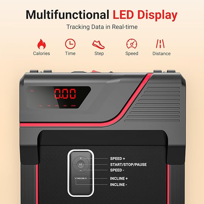 - Ease of Use: The Multi-Functional LED display on the running board shows speed, distance, calories , time, and step, making it simple to track your progress in real-time. Elevate your workout effortlessly with remote control, adjust the speed level easily. While running or walking, the sensitive remote control lets you conveniently adjust speed or stop
