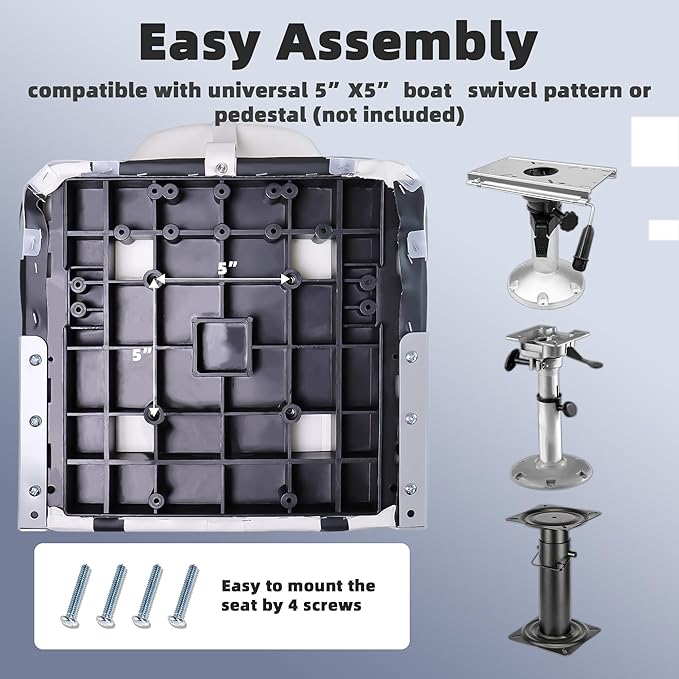 - Quick Installation: The bass boat seat is pedestal mounted, you simply bolt the seat to the base; Equipped with 4 locking screws located in the slots under the chair; Install on any standard 5'' x 5'' mounting bolt pattern; Fits most sizes of rotary joints or bases
