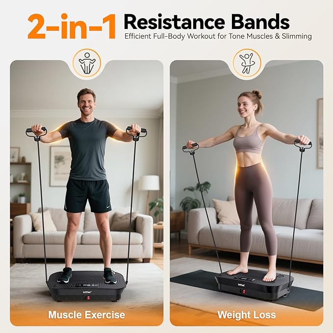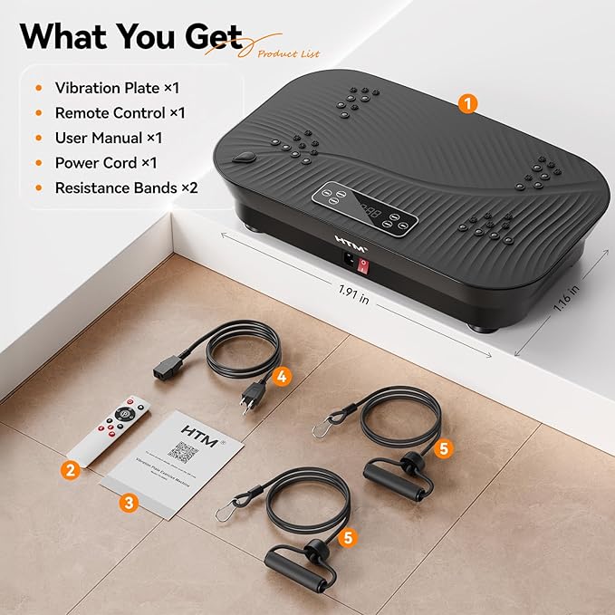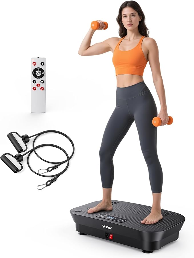 - Compact & Space-Saving Design: Lightweight and portable, this vibration machine fits under beds or desks with ease. Whether at home, gym, or traveling, stay fit anytime, anywhere with HTM's premium vibration plate