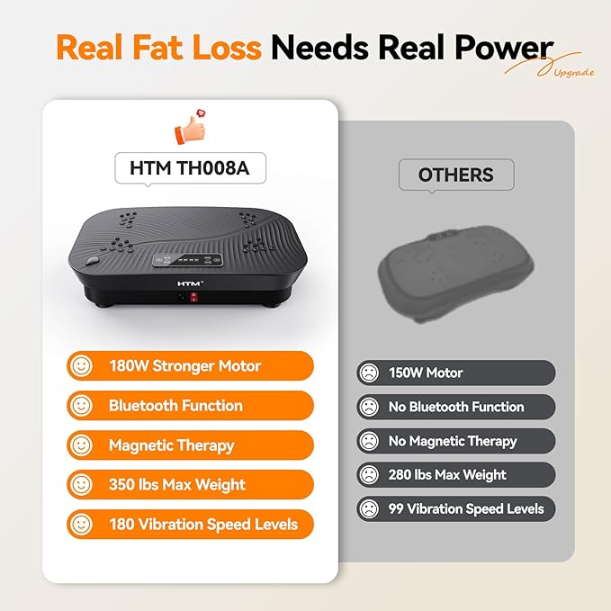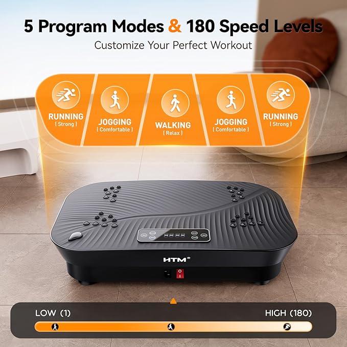 - Burn Fat & Tone Muscles in Minutes: Maximize workout efficiency with the HTM Vibration Plate! Its 180-speed settings and 5 pre-set programs deliver powerful vibrations to accelerate fat burning, boost metabolism, and sculpt your body in just 10 minutes daily. Perfect for busy lifestyles