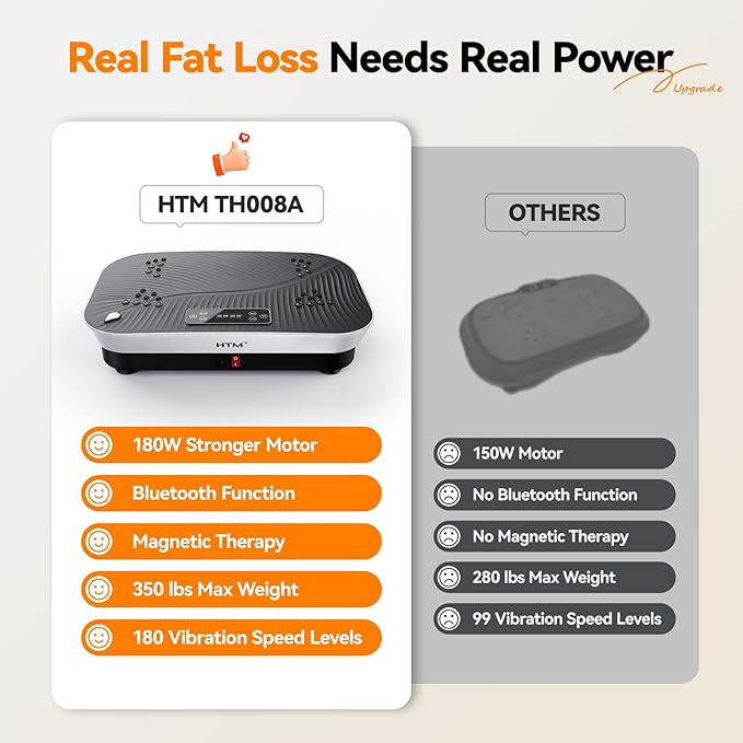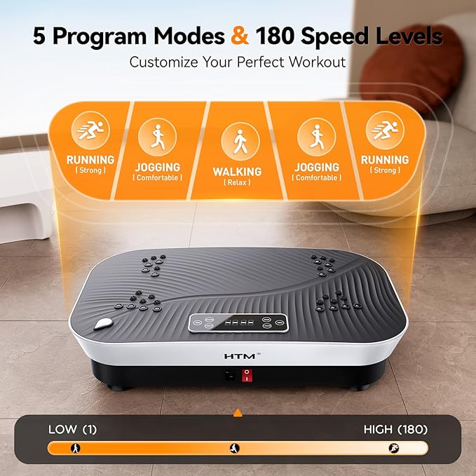 - Burn Fat & Tone Muscles in Minutes: Maximize workout efficiency with the HTM Vibration Plate! Its 180-speed settings and 5 pre-set programs deliver powerful vibrations to accelerate fat burning, boost metabolism, and sculpt your body in just 10 minutes daily. Perfect for busy lifestyles