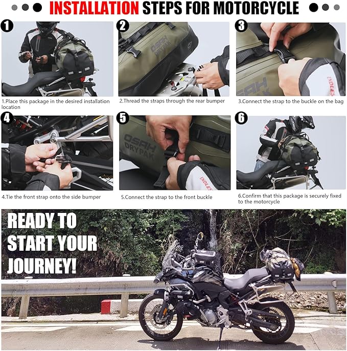- TRAVEL-READY SECURITY: Luggage bags can be securely fastened to motorcycles, boats, kayaks, and bicycles, ensuring stability even on rough terrain. The reflective elements on the bag body can improve visibility at night and enhance the safety of nighttime cycling. The dry bag is equipped with the Molly system, which can better carry excess accessories and increase daily playability