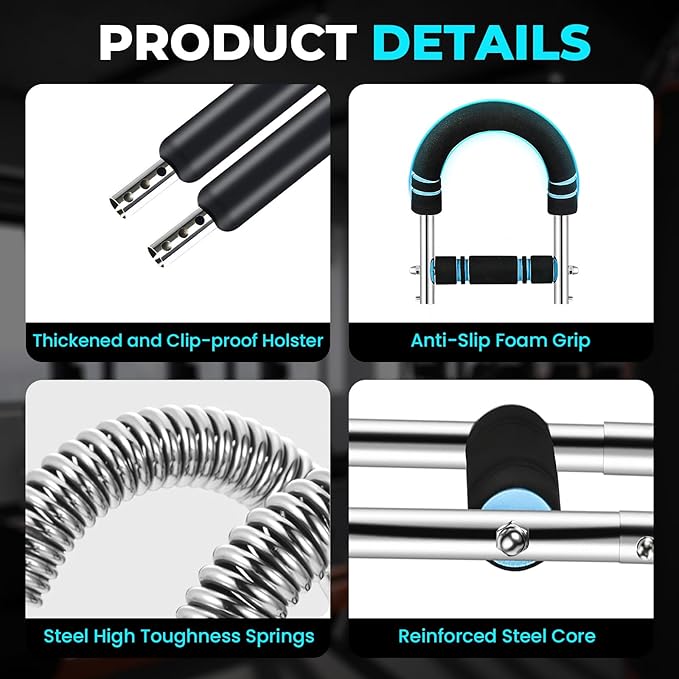 - 【Ergonomic & Durable Design】The twister arm trainer adopts plus extra-thick 26mm high-strength metal springs and industrial-grade bolts, long term use still has strong resistance. Each spring workout bar is wrapped with an elastic leather cover, which not only effectively reduces safety risks during exercise and prevents pinch injuries. Non-slip foam handles on both ends ensure a comfortable grip, preventing hand fatigue and discomfort during your workouts.