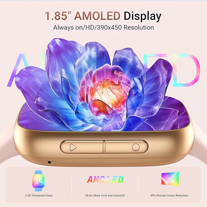 - 【AMOLED Screen & Dynamic Watch Dial】The 1.85” AMOLED HD touchscreen adopts 390*450 resolution and 60FPS high refresh rate design, making your touch interaction experience smoother. In addition, it also has 100% RGB color gamut and always-on display function, so you can clearly view the time, messages and sports data of the smart watch even in outdoor sunlight. More than 100 watch faces are available, especially supporting cooler dynamic watch faces