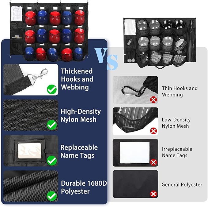 - EXTRA LARGE CAPACITY: This hanging helmet organizer (60.2" L x 41.7" H) features 15 reinforced mesh pockets designed to hold baseball/softball helmets, gloves, and gear securely. Additional name cards for easy identification and placement. The innovative left-side panel adds 3 dedicated zones: a dry-erase noteboard, pen slot, and secure pockets for phones/wallets—keeping personal items accessible and protected during gameplay.