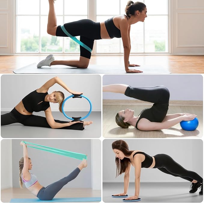 - 【All-In-One Pilates Ring Set】 This unisex blue pilates essentials set includes a 14-inch comfort Pilates ring, 9.8-inch non-slip Pilates ball, 5 resistance bands, 3 long elastic stretch bands, 2 glide discs, 1 pair of socks, and 4 workout guides. This Pilates kit will meet the workout needs of all ages with different fitness levels and goals.