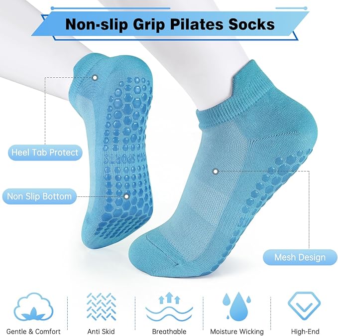 - 【No-slip Pilates Socks】 Pilates grip socks are soft and breathable, with a mesh design that helps absorb moisture and wick away sweat. The bottom of the socks is equipped with silicone anti-slip dots to enhance traction and prevent slipping, providing excellent stability and balance on wooden floors, in gyms, or on yoga mats, effectively preventing slips and falls.