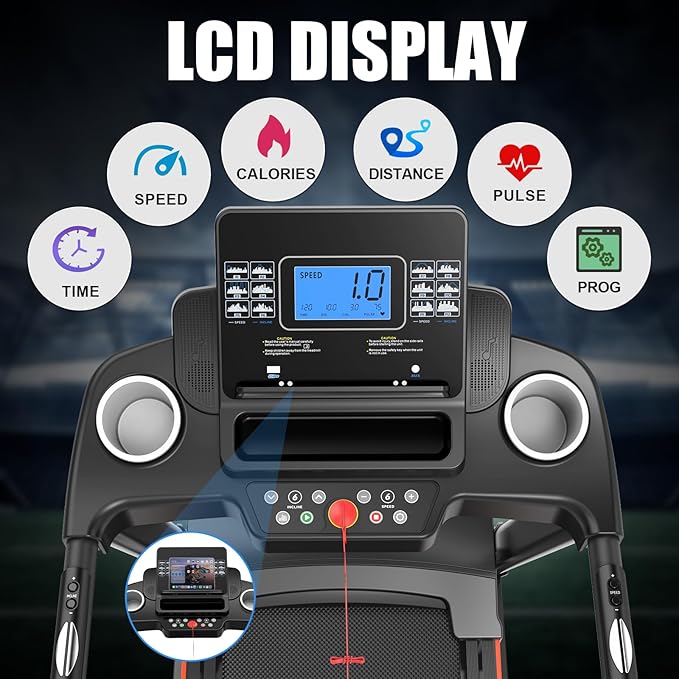 - 【User-Friendly Console and APP】 This large LED display offers clear readouts of your speed, time, distance, calories, heart rate, and steps. You can also connect to the smart app via Bluetooth to control the treadmill 400LBS capacity.Additionally, the walking treadmill with auto incline features a smart heart rate monitor with built-in handrail pulse sensors for real-time tracking, ensuring you stay within your target heart rate zone.