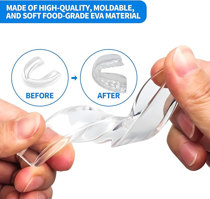 - Custom Fit with Boil-and-Bite Method: After boiling water, let cool for 3 minutes. Soak mouthpiece for 20 seconds, then bite and press to mold. Cool in cold water for 30 seconds to finish. Repeat if needed.
