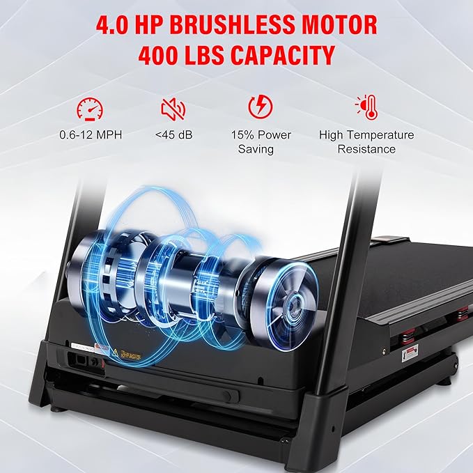 - 【4.0 HP Powerful Motor & 400 lbs Capicaty】 The treadmill for home equipped with a brushless 4.0 HP motor, supports up to the speed of 12 MPH and 400 lbs weight capicaty, can bring you and your family a more free and comfortable running experience. Unlike traditional motors, this friction-free design ensures ultra-quiet operation and long-lasting performance.