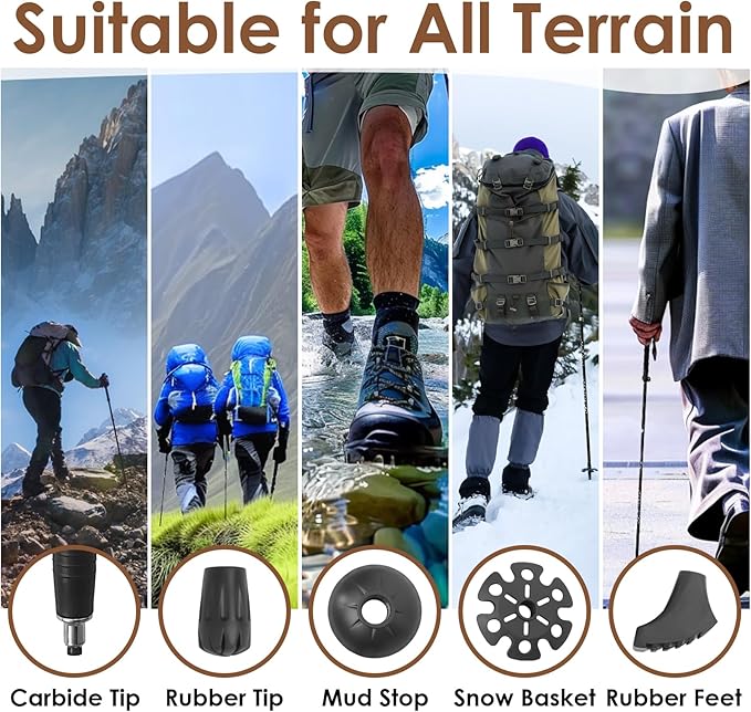 - 【Versatile for All Terrains】 : Conquer dirt, snow & mud with interchangeable tips: 2 Rubber Tips, 2 Boot Tips, 2 Snow Baskets, 2 Mud Baskets. A must-have collapsible hiking poles set for hikers backpackers.
