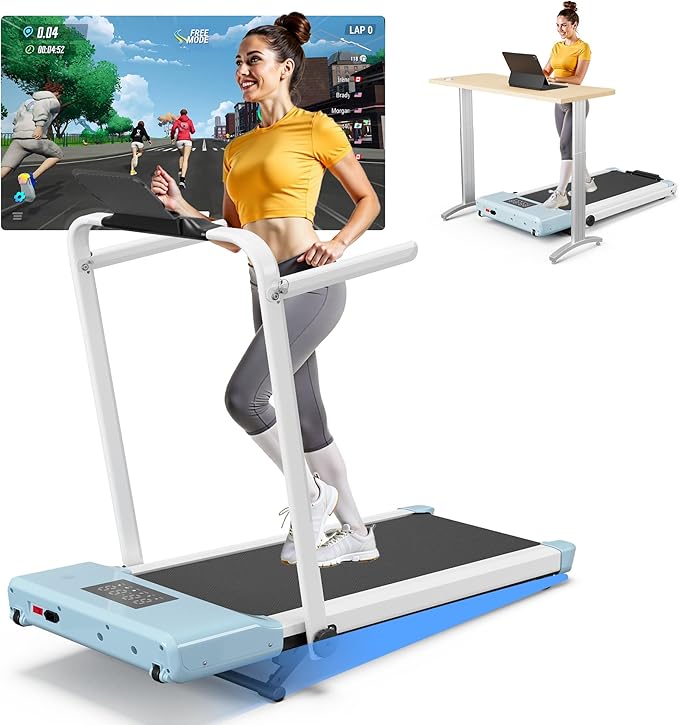 - Walking Pad Treadmill with Handle bar : The 3-in-1 treadmills offers a range of functions that cater to different fitness needs. It can be used for walking, jogging, and running, providing a versatile workout experience.When the riser is folded, it can be used as a walking pad treadmill under desk at a speed of 0.6-3.8mph. When the handrail is raised, it can be used as the running speed is 0.6-7.5mph
