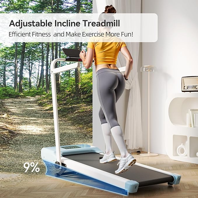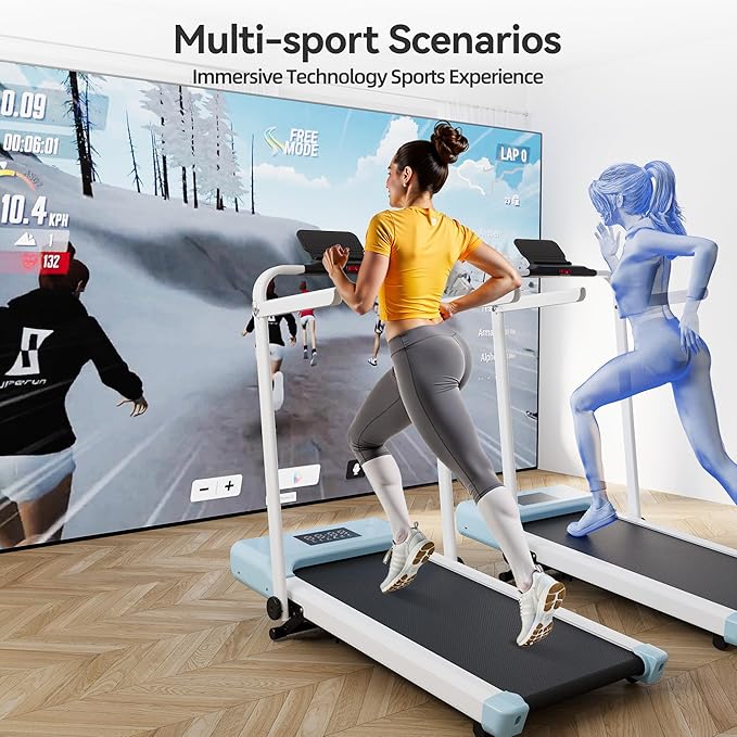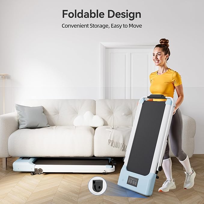 - Folding Treadmill for Small Spaces : The foldable treadmill design is a great space-saver, especially for those with limited living space. You can easily fold it up and store it away when not in use, freeing up floor space for other activities. The small treadmill folded height is only 5 inch makes it effortless to store in any place, even under the bed or sofa, occupying a minimal amount of space
