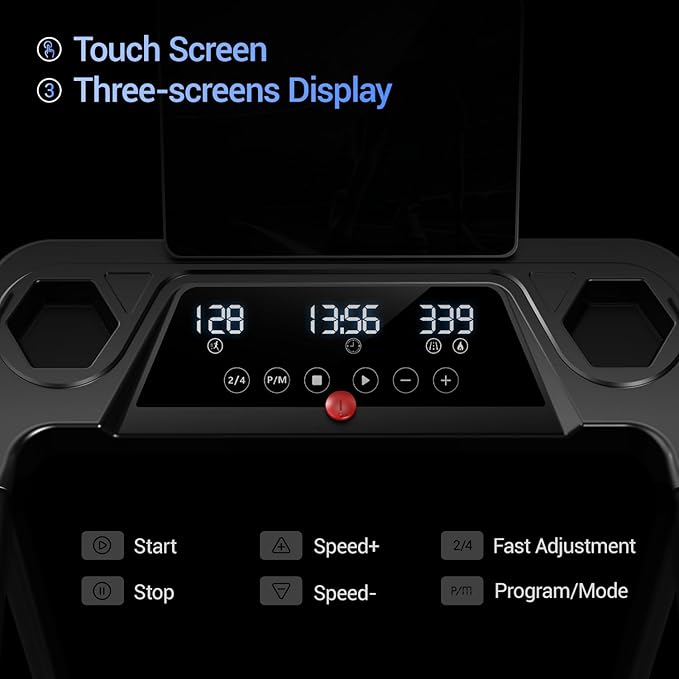- 3 Touch Screen Display & Foldable Design: This treadmill with handles features a triple display that shows time, speed, distance, and calories burned in real time and allows you to improve and adjust your workout program at any time with Touch buttons on the display. This foldable treadmill has a built-in water cup holder and tablet/cell phone holder, making it easy for users to place their belongings while working out