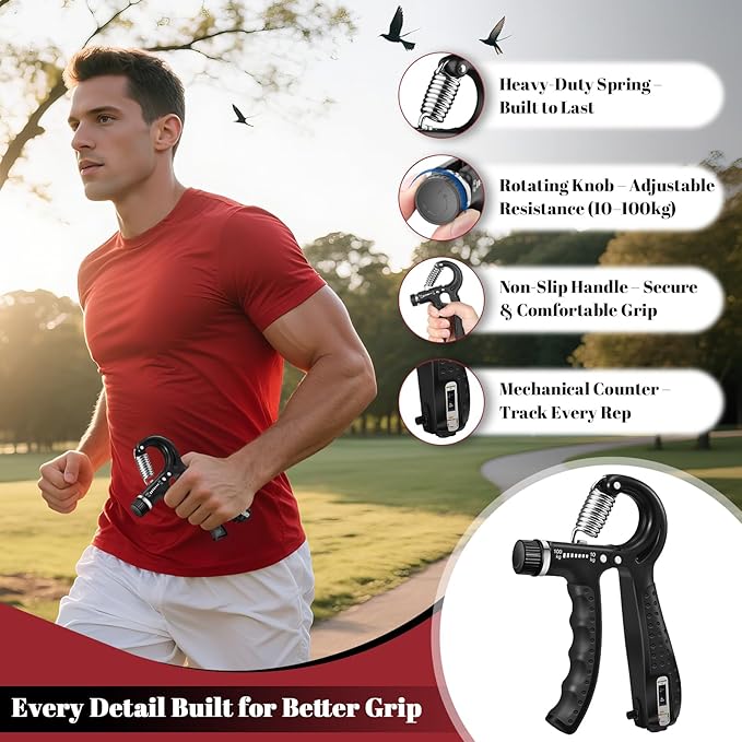 - Adjustable Hand Gripper with Counter: Built with a mechanical counter, this grip strength lets you track each rep while offering adjustable resistance from 10 to 100kg, making each session measurable and motivating. Perfect for beginners and advanced users looking to train progressively and effectively.