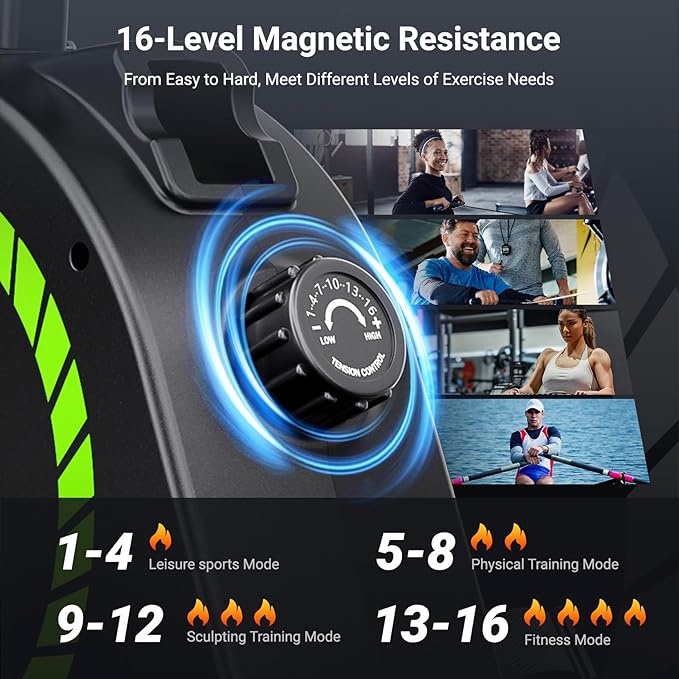 - 16-Level Magnetic Resistance: The rowing machine offers 16 levels of magnetic resistance that can accommodate all skill levels. Whether you are an experienced rower or a beginner, you can easily adjust the knob to tailor the difficulty and challenge yourself. It's a great gift for fitness enthusiasts and families