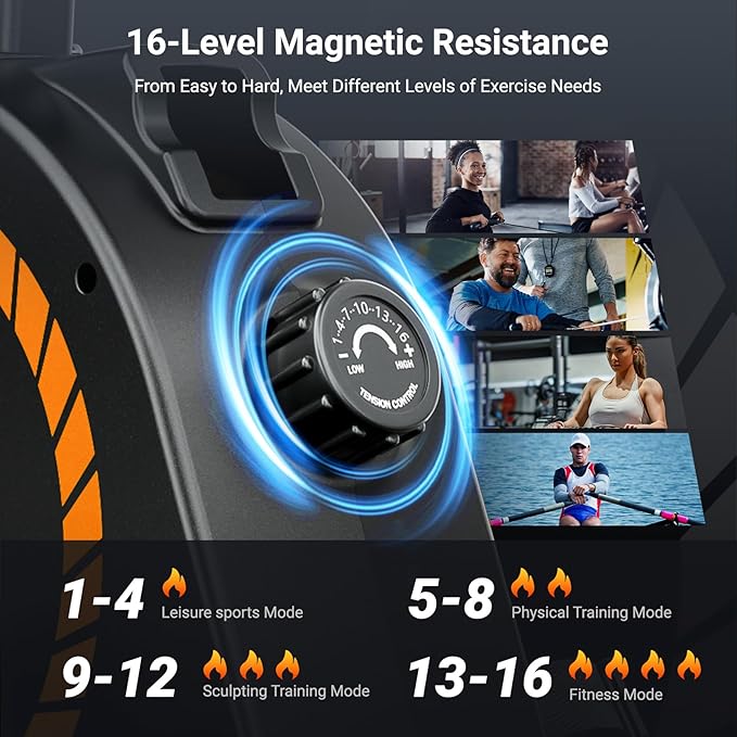 - 16-Level Magnetic Resistance: The rowing machine offers 16 levels of magnetic resistance that can accommodate all skill levels. Whether you are an experienced rower or a beginner, you can easily adjust the knob to tailor the difficulty and challenge yourself. It's a great gift for fitness enthusiasts and families