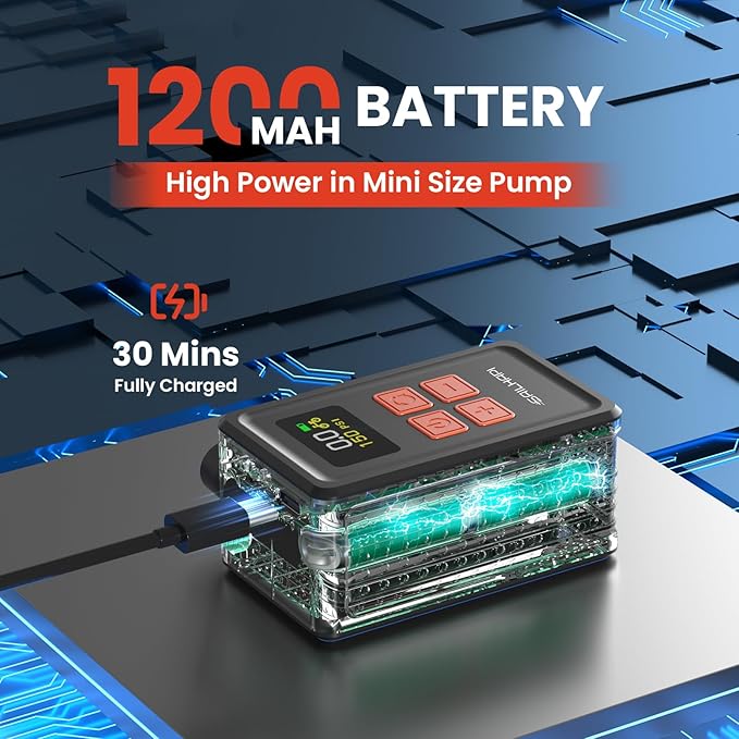 - 【Quick Charge & Powerful】 Our portable bike pump comes with 1200mAh battery, can be charged fully in 30 minutes with Type-C cable, this small bicycle pump can inflate 700x25C tires 2-3 times per full charge, inflates a road bike tire (0-120psi) in just 80 seconds, perfect for emergencies or camping.