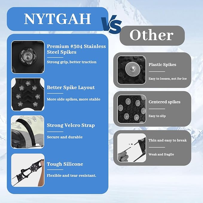 - [STABLE & SECURE FIT]The one-piece 3D design of the ice shoes grippers ensures an excellent elastic fit, securely wrapping around various types of shoes, including sneakers, men and women's snow boots, and mountaineering boots. The upgraded Velcro straps of ice spikes for shoes provide extra reinforcement, ensuring a more stable and comfortable fit for long-term use.
