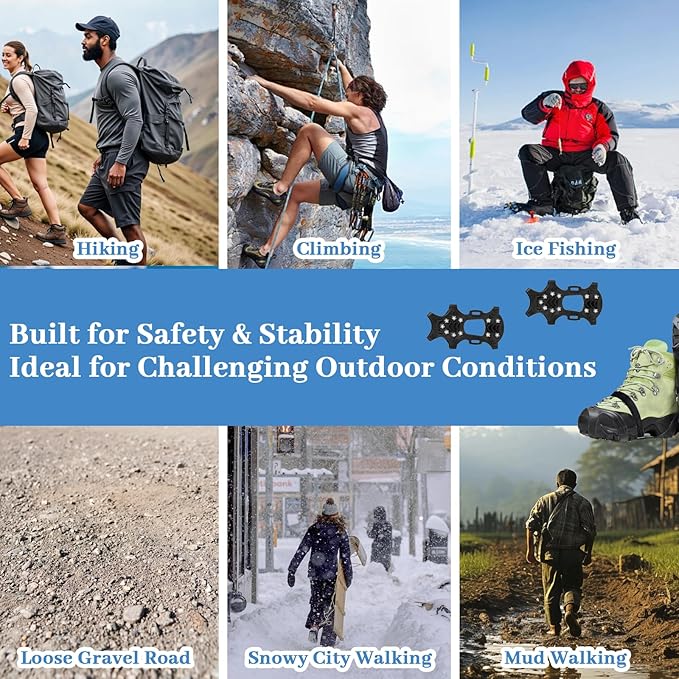 - [WIDE RANGE OF USERS AND APPLICATIONS]These crampons ice cleats are suitable for men, women, and people of all ages. They perform well in complex snow-covered terrain, such as steep trails, icy roads, frozen driveways, and muddy woodland areas. These ice cleats for women men are especially ideal for winter trail running, hiking, and ice fishing—helping you fully enjoy the snowy outdoors.