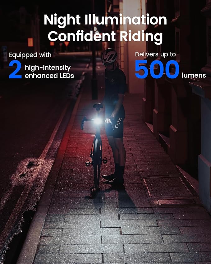 - [Daytime Flashing for Visibility] Features 6 lighting modes with 3 flashing options for daytime safety, reaching up to 500 lumens with a wide 270-degree viewing angle; The led bicycle light keeps you visible to vehicles and pedestrians from the front and sides, with high lumen penetration helping you get noticed under any sunlight