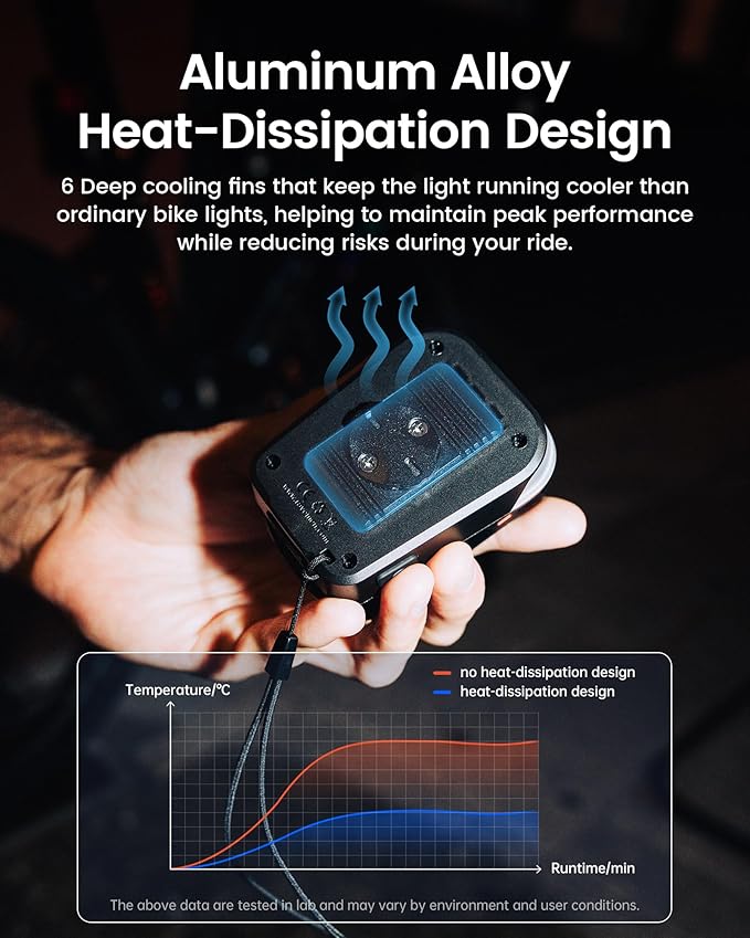 - [Efficient Heat Dissipation] Built with an aluminum alloy bottom and 6 air guide grooves, the bike headlight keeps its working temperature lower than ordinary bike lights during extended use, helping prevent performance drop and overheating