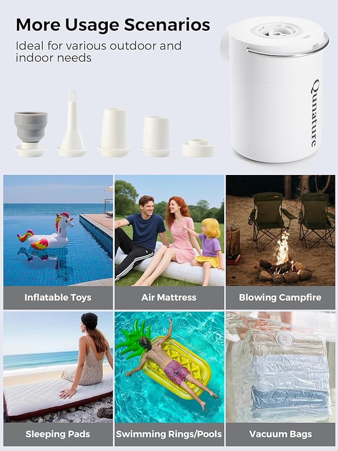 - Robust Inflator & Deflator: This cordless vacuum inflation pump, equipped with 5 specialized nozzles, serves as an excellent tool for both inflation and quick deflation. This air pump for inflatables provides a maximum output pressure of 5.0 kPa and a rapid gas flow rate of 400 L/min. Compatible with a wide range of inflatable items, including air mattresses, inflatable beds, pool floats, sleeping pads, swimming pool rings, inflatable furniture, and other inflatable toys.