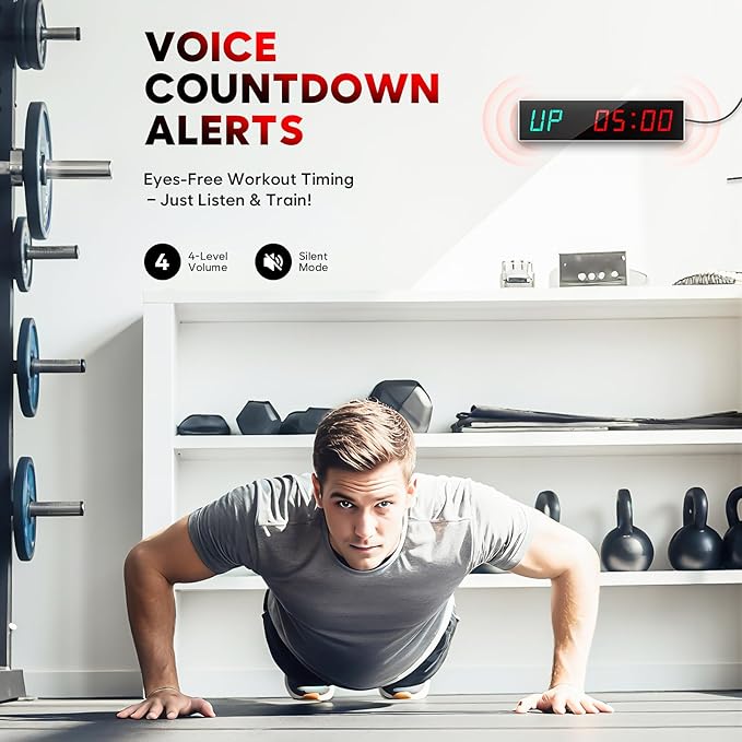 - 【99dB Buzzer with 4 Volume Levels】No matter how hard you’re pushing or which way you’re facing, this gym timer clock for home gym makes sure you never miss a cue. With a loud 99dB buzzer and 4 adjustable volume levels, you’ll hear every alert — whether it’s a quiet room or a noisy garage gym.