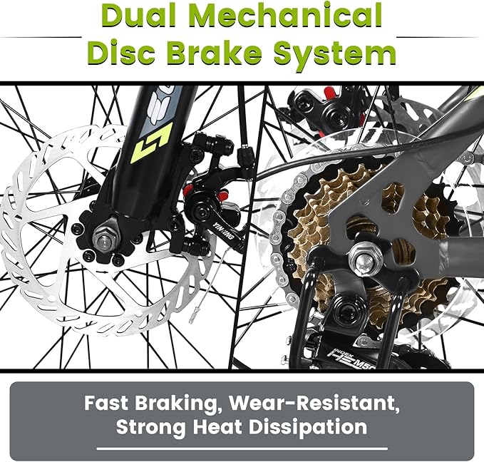 - [Dual Disc Brakes for Ultimate Stopping Power] Equipped with responsive dual disc brakes, this MTB provides exceptional stopping control, even in wet or muddy conditions. Combined with a front suspension fork that absorbs shocks, riders enjoy a stable, confidence-inspiring ride.