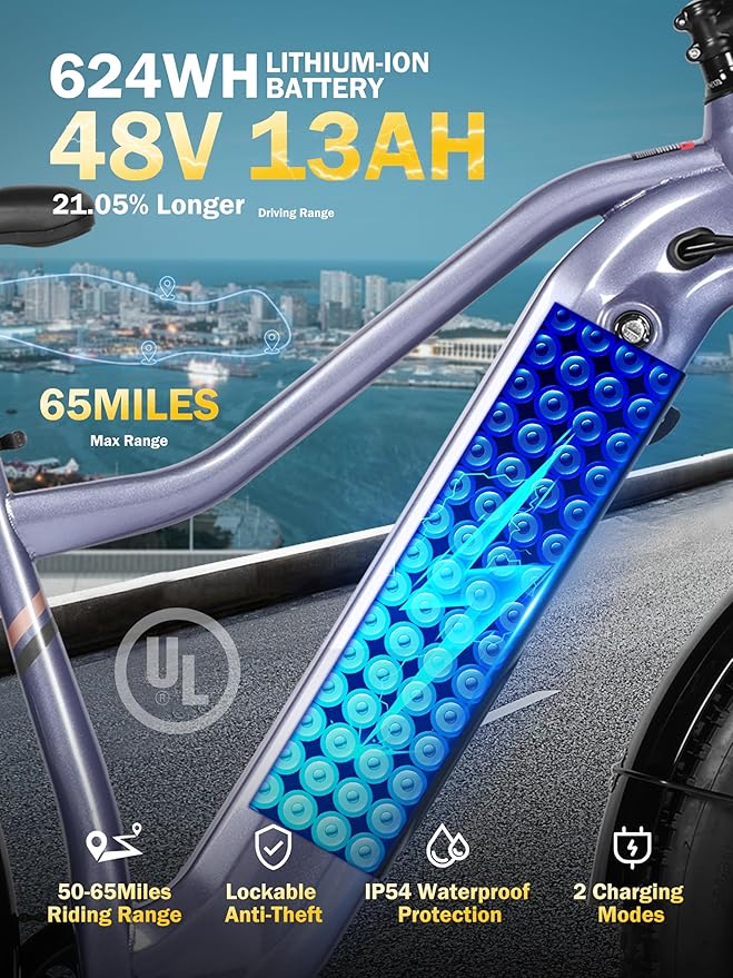 • Removable long-lasting battery : The electric bike for adults with a high-capacity long life 48v13Ah battery,provides up to 50miles (throttle)/65miles(PAS) of range with 25% more capacity for an additional 21.05% more range than other models on the market for extended ride with fewer charges.Removable battery for convenient charging.Full charge in 6-8 hours.