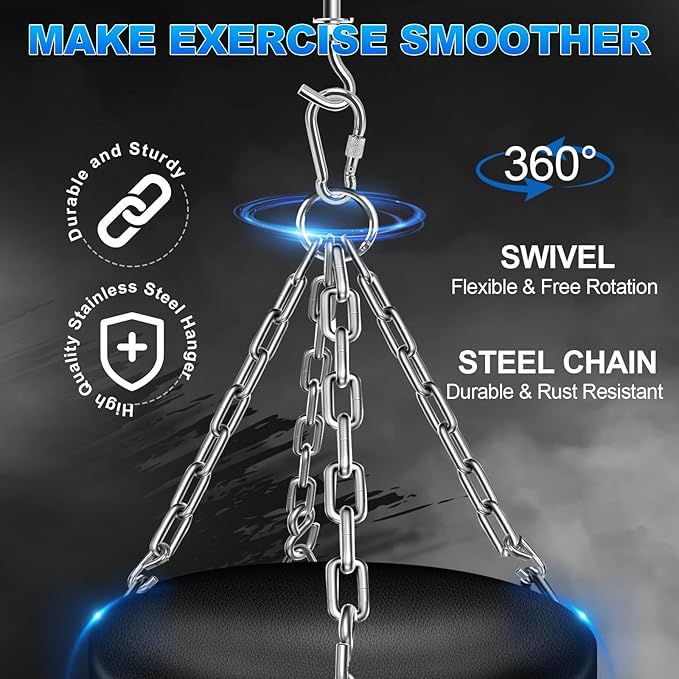 - Stainless Steel 360° Swivel: The sturdy 360° swivel ensures that the heavy punching bag rotates flexibly and has strong load-bearing capacity, fully ensuring your safety and stability during use