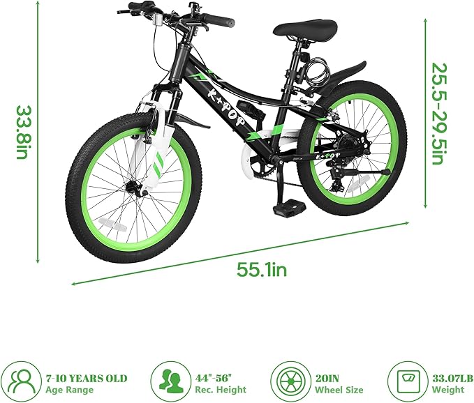 - 7-Speed Transmission System: The 7-speed transmission system provides a variety of speed options, and the gear shifting is smooth and efficient. Whether it is accelerating on a flat road or climbing a steep slope, children can easily switch and enjoy a smooth riding experience. The 20/24 inch bike quick-release front wheel design makes disassembly and maintenance easy and convenient