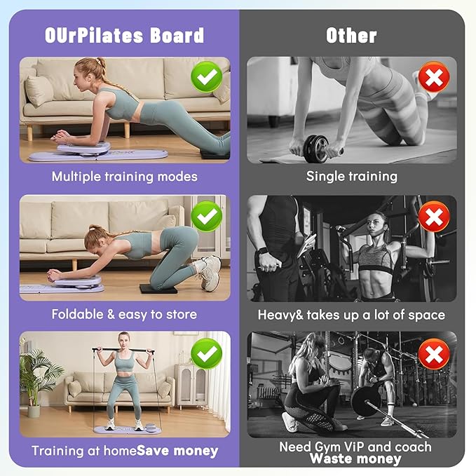 - 【Multi-Purpose Pilates Board】Joxir pilates reformer set combines the functions of pilates board, resistance band, ab wheel, push-up handle, balance board and plank support, and can be combined into at least 7 forms, unlocking at least 15 exercise movements; helping you to effectively exercise your whole body muscles, achieve the effects of full body exercise, body shaping, fat loss, and body improvement.