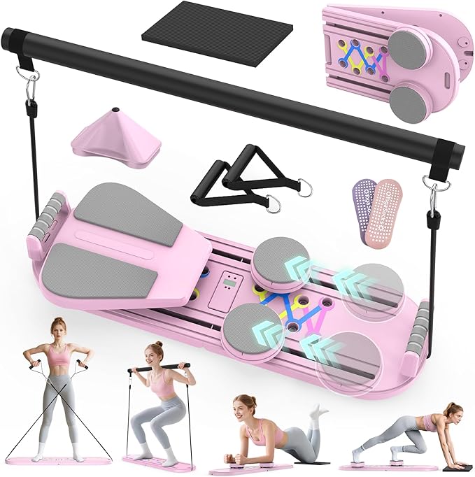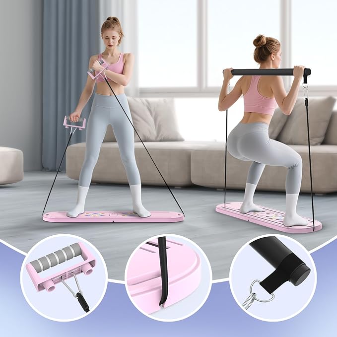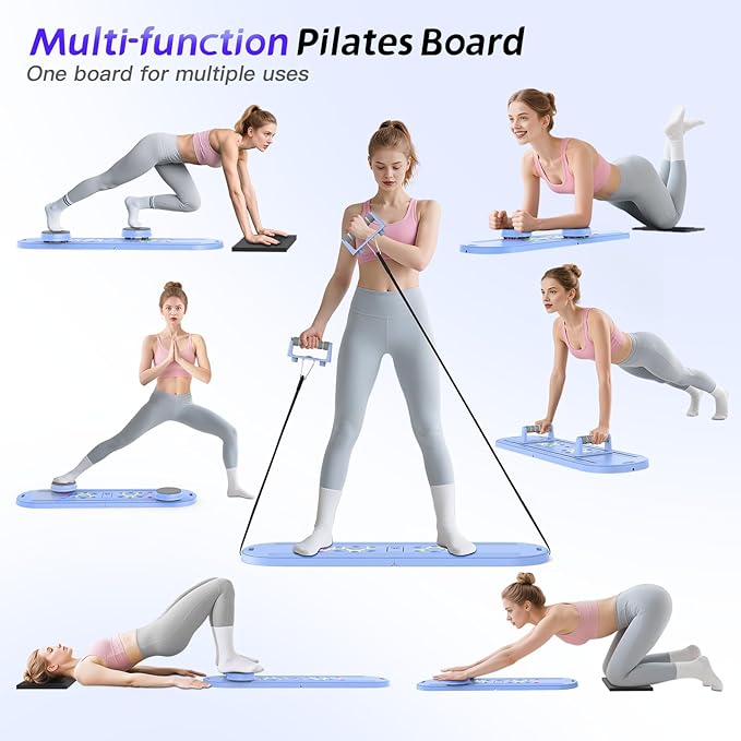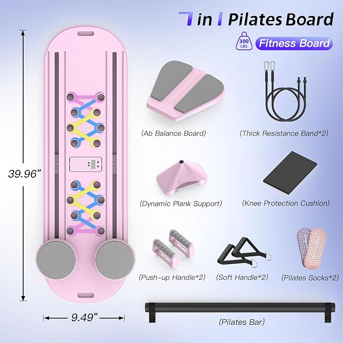 - Upgraded 7-in-1 Pilates Reformer Board - Unlock 15+ exercises with this all-in-one Pilates reformer board, combining Pilates board, resistance bands, ab roller, push-up handles, balance board, plank support, and Pilates bar. Perfect for core, glutes, legs, arms, and full body sculpting β bring the versatility of a home gym to any space