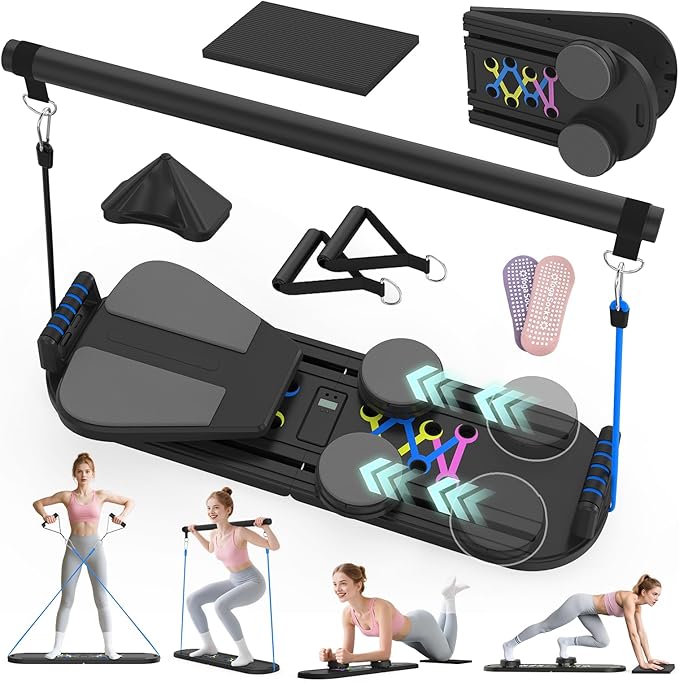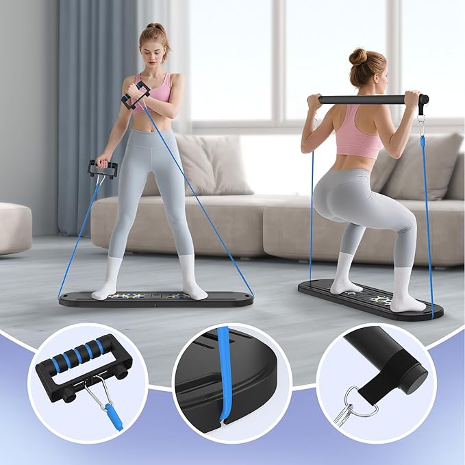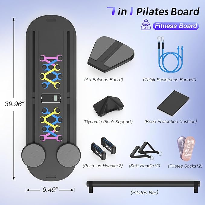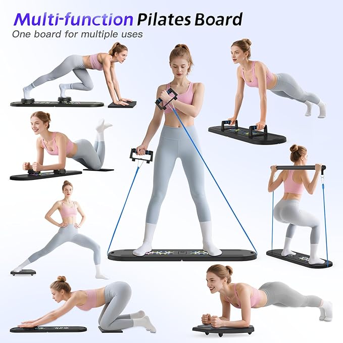 - Upgraded 7-in-1 Pilates Reformer Board - Unlock 15+ exercises with this all-in-one Pilates reformer board, combining Pilates board, resistance bands, ab roller, push-up handles, balance board, plank support, and Pilates bar. Perfect for core, glutes, legs, arms, and full body sculpting β bring the versatility of a home gym to any space